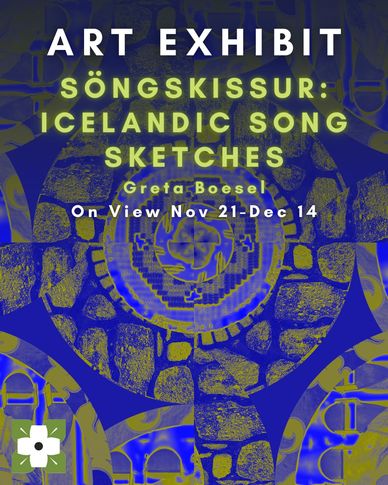 This show is a collection of 33 cantographs, or visual representations of songs, rendered in textile work, assemblage, collage and digital media, reflecting Icelandic music from the 14th century to present.